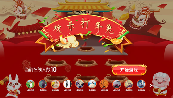年会版可爱兔子画面,跟打地鼠一样玩法,打中地鼠加1分,打中小猪减1分,手机不停打跳出来的地鼠和猪,大屏实时显示分数榜 最后可查询前100名成绩,手机也可以看,可以自定义显示前N排名,还能设置中奖不能再参与,倒数时间可以自定义,很好玩的功能。