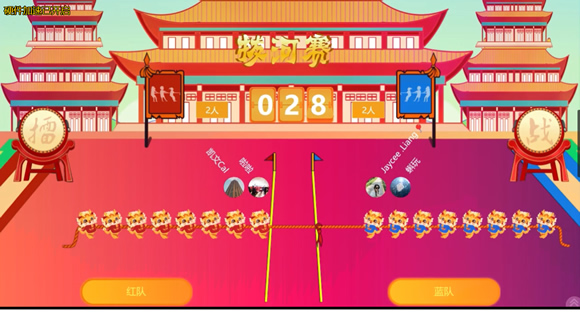 摇一摇拔河比赛,支持2队进行pk大屏,可以限制每一队参与人数,大屏实时显示队伍里面最快的前十名头像切换,是公司年会最热门的团队类比拼游戏