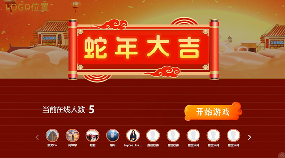 年会版可爱蛇卡通推着金币,预示着新的一年财源广进,默认是摇一摇可以边看大屏一起摇一摇,手机还可以切换转圈比速度,前十名速度最快的显示摇的的过程 大屏幕10名的头像昵称都变动几百人谁速度快就显示他1秒切换,最后可查询前100名成绩,手机也可以看,可以自定义显示前N排名,还能设置中奖不能再参与,倒数时间可以自定义,很好玩的功能。